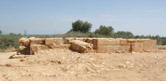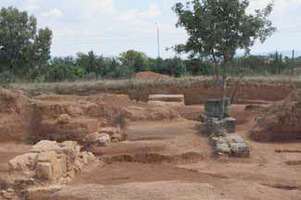 Fig. 2/ Vue d’un tronçon du rempart Sud de Cassandreia : on distingue, de part et d’autre, les deux parements en blocs de pierre et entre eux, au fond, une partie de la structure en briques crues