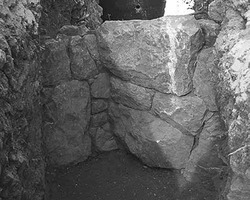 On a dégagé quatre tronçons de murs ; un en particulier, en gros blocs de pierre (fig. 1), appartiendrait à une maison du IVe s. av. J.-C. fouillée en 1985.
