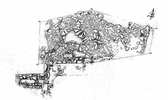Au Nord-Est, on a dégagé les vestiges d’un autre édifice à abside, daté de la transition entre le BM III et le BR I. Dans un deuxième état de construction, un édifice orthogonal, avec des cloisons internes, s'est accolé à celui-ci et l'édifice à abside a probablement servi au stockage. Au BR III, l'addition d'une structure orthogonale allongée au Sud-Ouest constitue une troisième phase d'occupation. Ces édifices (fig. 1), dont on n’a retrouvé que les fondations et soubassements fragmentaires en moellons de calcaire et mortier d’argile, avaient probablement une élévation en briques crues. On y a recueilli de la céramique commune (jarres, marmites, amphores, bols), mais également un kylix ou des skyphoi, dont certains décorés, pour la dernière phase.