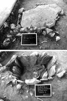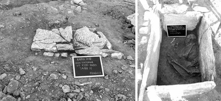 On a également découvert vingt-six tombes à ciste dont les dates s’échelonnent entre le BA II et le BR I. Leur taille varie selon le nombre d’inhumations ou l’âge des défunts ; ceux-ci étaient déposés en position fléchie, la tête souvent posée sur une pierre plate. La couverture des tombes consistait en une ou plusieurs dalles, tandis que les parois étaient en petites pierres plates de calcaire pour les dix-huit sépultures supposées plus anciennes (BA II-BM I ; fig. 2), ou en quatre dalles soignées de calcaire pour les huit autres, considérées plus récentes (BM II-BR I ; fig. 3). Seules deux de ces dernières ont livré du mobilier (un anneau en bronze, un vase, une fusaïole en argile, une perle en pierre).