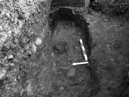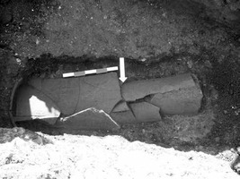 Outre les restes du défunt, déposé en position allongée, la tête à l’Est et à même le sol, la sépulture, qui était construite à l’aide de tuiles laconiennes, n’a livré qu’un bol à enduit jaune-beige ; un petit skyphos du même style, ainsi qu’un fragment d’arytère ont été recueillis à l’extérieur de la tombe. Ces trouvailles datent la sépulture de la première moitié du IIIe s. av. J.-C.
