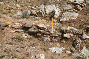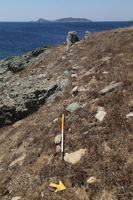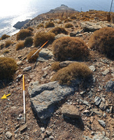 La prospection a révélé 70 lieux de découverte qui témoignent de l’exploitation intensive de l’arrière-pays de Geraistos (fig. 2). D’après l’observation préliminaire des trouvailles de surface, la majorité de ces sites appartiennent à l’époque classique et hellénistique (environ 29 sites) et à l’époque romaine tardive (environ 20 sites). Parmi les deux sites préhistoriques, l’un est une occupation importante du Néolithique final et de l’Helladique ancien avec des vestiges de murs à l’Est de la baie de Kastri (fig. 3). Cinq sites sont postérieurs à l’époque romaine.