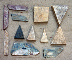 - de nombreux types de marbres sont employés dans les décors pariétaux du macellum. Les marbres blancs sont majoritairement présents : ils correspondent les plus souvent, mais pas systématiquement, aux éléments de placage les plus grands ; pour les éléments de placage plus petits, il existe une plus grande variété, avec d’assez nombreux éléments de marbre de couleur. L’identification de ces échantillons n’est pas achevée, mais on peut d’ores et déjà conclure qu’une part importante des marbres est d’origine thasienne. Plusieurs marbres d’importation ont également pu être repérés : marbre sombre des carrières de Mytilène, marbres rouges de Chios ou d’Erétrie, marbre vert de Carystos.