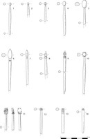 - les stigmates présents sur certains artefacts témoignent des techniques de fabrication employées. Le corps des épingles, notamment, présente ainsi des facettes de raclage bien visibles parfois associées à des stigmates d’abrasion ; ces derniers sont également présents sur la tête des épingles tronconiques et, le cas échéant, au niveau de la gorge qui sépare le corps de la tête.