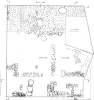 Dans la partie centrale du terrain, les vestiges de deux pièces, limitées au Nord par le mur de terrasse Sud de la rue antique, appartenaient à une maison. À l’intérieur des pièces, on a dégagé une couche de destruction composée de tuiles, ainsi que les restes d’une poutre brûlée de grande taille, vraisemblablement une pièce de la charpente. On a également retrouvé, parmi les fragments de tuiles, des fragments d’anses d’amphores timbrées et de la céramique. Ces pièces et le premier état de la rue peuvent être datés du dernier quart du IVe s. av. J.-C. Enfin, à un niveau inférieur, la fouille a dégagé des fosses comportant de la céramique datée du Bronze Moyen et du début du Bronze Final.