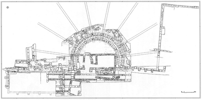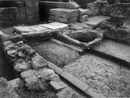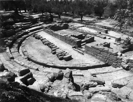 Thouria. X. Arapogianni (ASA) reports on a further season of excavation of the ancient theatre of Thouria (Figs 1-2). The orchestra was completely uncovered, over which, following its abandonment, a long building (18m L x 6.15m W) was constructed using stone from the theatre and preserved to a maximum H of 1.40m. Its interior was divided into 3 intercommunicating rooms and in one area were remains of a wine-press (Fig. 3) revealing the agricultural nature of the building, according to the excavator. Within the building were found a layer of roof tiles, undiagnostic later pottery and fallen walls, among which was found a fragmentary statue of Athena preserving the aegis (Fig. 4). Outside the building rooms had been built as additions, also of agricultural nature, in one of whose walls was found part of a relief. These additional rooms also covered part of the channels of the moving skenotheke, whose extent is thus further confirmed. On the S side of the cavea were recovered remains of the S parodos, 15m L, preserved to 5 courses, with 5 pillars.