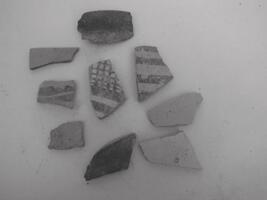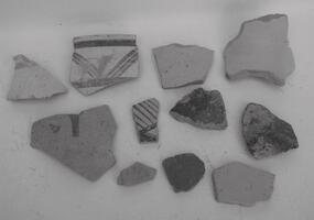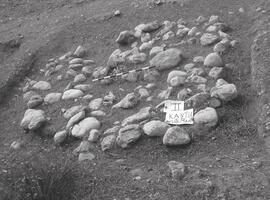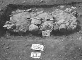 Trench 3: Cist grave 2 was found, oriented E-W (Fig. 4). The covering slabs are sandstone, apparently from the prehistoric beach region to the south. Smaller stones were arranged in a row around the covering slabs. Tomb 2 is immediately east of the circular tumulus. Inside the tomb is an adult skeleton, supine, head to the east, without grave goods. There were also a few lower limb bones from an older burial and sherds of the LMH period (Fig. 5). Similar sherds were found in the trench. Similar circular tumuli have been found at Dendra of the MEIII-LHI period and at Asine. These tombs built with circular stonework in the Argolid were in use until the LHI and before the establishment of chamber tombs as monuments. The semi-circular wall around tomb no. 15 (tumulus Γ) does not correspond to the circular stone mound and is related to the chamber tomb.