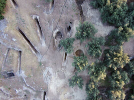 Aidonia, which lies in the NW foothills of the wine region of modern Nemea, historical Flyasia, was a significant centre in the region in the Mycenaean period (c. 1700-1100 BC). Aidonia became known after extensive looting of the Mycenaean cemetery, probably in the winter of 1976-77. A rescue excavation by the Archaeological Service (1978-80; 1986) under the direction of K. Krystalli-Votsi and the supervision of K. Kaza, brought to light 20 Mycenaean tombs, the majority chamber tombs arranged in one basic group.