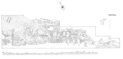 Excavation also began on the slopes of the hill, where a Roman cemetery was found (Fig. 2). A vaulted, double-chambered tomb carved into the natural conglomerate rock was excavated. It was preserved fragmentarily with a N-S orientation. The central S chamber was excavated. The roof and S wall are not preserved. Inside the chamber, 7 tombs had been carved into the rock. The graves were largely unlooted and yielded a host of small finds: clay lamps with handle and embossed decoration, intact glass vessels, coins, a bronze mirror and bracelet, a gold earring. An inscription with the name of the craftsman (ΟΛΥΜΠΙΑΝΟΥ) was preserved on a lamp. All graves contained multiple burials, while Grave 2 had been used as an ossuary.