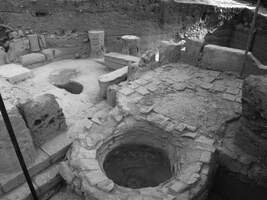 Ancient Thouria, Panagitsa. Xeni Arapogianni (ΛΗ ΕΠΚΑ) reports on continuing excavations at this location. At the end of this season, the whole N side of Building Γ as well as the pebble floor of the pavement that runs around the outside of the building and the same kind of floor was revealed internally in the W part of the building (Fig. 1). Supplementary research on the building of the winepress (6th-7th c. AD) revealed almost completely the rectangular paved space. In the floor there are also spolia of architectural members (Fig. 2).
