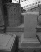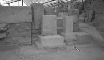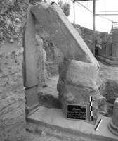 Building B: Ionic Stoa. This year the W part of an Ionic colonnade was revealed S of Building A (Fig. 3). At the E extreme of the colonnade there is still in situ the jamb of the entrance gate with a fallen part of the Ionic epistyle (Fig. 4). A water channel runs along the outer side of the colonnade and it is slightly concave (Fig. 5). At 2 points along the channel there are oval sediment basins. In the space between the Ionic stoa and Building Γ, the excavation uncovered a large quantity of animal bones (pigs, boars, cows, chickens, roosters, etc.) and shells that were strewn across the area.
