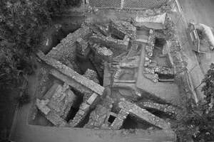Small finds: a complete golden ring (M39), a bread stamp (MS 17000), black glazed askos of the Guttus type (MS 17002), torso of a marble nude male statue (MS 17003), and 2 inscribed bases (MS 17005, 17009). A quantity of fragments of glass vases and fragments of marble revetments, and architectural members found in destruction layers or as spolia in walls.