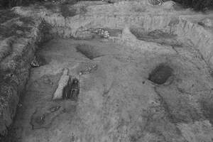 Grave 7 (NE-SW): Adult burial. The dead was placed directly in the ground with contracted posture and turned to the N and covered with pithos fragments. The head was to the W. A pot was collected from the grave.
