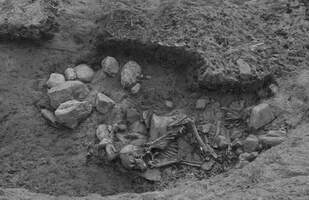Grave 3 (E-WNW, head to E): WNW of grave 2; unworked stones cover an adult burial in contracted posture. At the legs and the head there were fragments of 2 vessels at each point.
