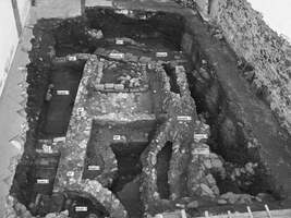 In the rest of the area, built channels and part of an ancient street were found. In particular, to the E of the bath a built vaulted drain (Drain 1) with N-S direction was discovered. Its direction, which was not exactly straight demonstrates its attempts to accommodate the bath building. A second drain (Drain 4), with the same direction, was attached to the E side of Drain 1. Built Drain 2 meets Drain 1 at its N end. N of the bath and S of Drain 2, another build drain (Drain 3), with E-W direction was found.