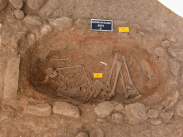 - dans le secteur C, la fouille a poursuivi la mise au jour de vestiges architecturaux du Néolithique Moyen, ce qui est nouveau pour cette période dans le Sud de la Grèce. On signalera notamment un petit édifice rectangulaire de 3 x 2 m, dont le soubassement en pierres est recouvert d’enduits par endroits, et une fosse à détritus partiellement explorée, qui a déjà livré plus de 8 000 tessons. La tombe identifiée à la fin de la campagne 2003 et creusée dans des niveaux d’habitation du Néolithique Moyen a également été fouillée : de forme ovale, bordée de pierres dans sa partie supérieure, elle contenait le squelette d’un adulte en position fléchie sur le côté gauche. (fig. 1) Enfin, un sondage a atteint le terrain vierge : le mobilier céramique retrouvé au-dessus de ce terrain vierge date du début du Néolithique Moyen.