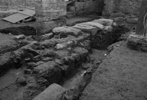 Parts of three walls were excavated in the area of the modern stairwell (Fig. 5). The base of a large Ionic column had been used as building material for one of the walls (Fig. 6).