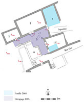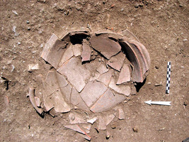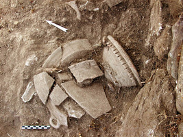 - un sondage implanté dans l’angle Sud-Ouest de l’oikos 5 a mis au jour une série de trois sols de terre battue successifs séparés par de fines recharges. Le matériel trouvé sur les sols et dans les recharges est abondant : il s’agit exclusivement de matériel culinaire postérieur à 150 av. J.-C (fig. 2). La date de l’oikos et sa fonction (cuisine ou salle de banquet ?) semblent donc établies. – Dans une phase d’utilisation postérieure, on a ouvert dans le mur Ouest un accès à un petit réduit, où ont été mis au jour deux sols successifs ; sur le plus ancien étaient posés plusieurs plats empilés (fig. 3), une lampe à huile complète et une petite amphore brisée : la pièce a dû servir de lieu de stockage de vaisselle et de denrées.