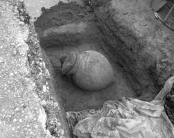 Grave XI (pithos): the pithos was lying on its side with the mouth to the NW. Inside the pithos there were pieces of bones and the skull of a child. Two pyxides with globular body and a lid, similar to those of Grave 1, were the only grave goods. Date: first half of the 5th c. BC.