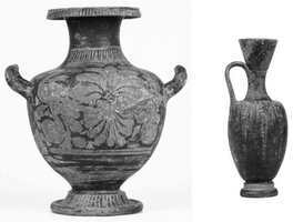 Grave III (Fig. 13; cist): made from rectangular clay slabs; head to the SE. Only a few skull bones are extant. Around the lower legs, 1 lekythos and 1 hydria with painted palmette decoration (Fig. 14) and a miniature pot were placed. The grave is dated to the end of the 5th-beginning of the 4th c. BC.