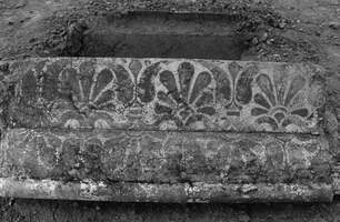 On the W narrow side, in Trenches A/09 and B/09, after the removal of fallen architectural members that were found last season, complete sections of the raking sima (επαέτια σίμα) of Megarian type were found (Fig. 2), as well as fragments of the clay corner spout in the shape of a lion’s head.