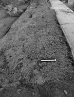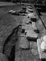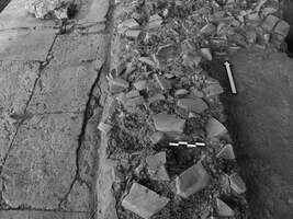 The N pteron of the temple was investigated. In the past in this spot, part of a lime plaster floor was found. Below a section of disturbed fill, an extensive destruction layer consisting of pan-tiles of Corinthian and covering tiles of Laconian was found (Fig. 3). On many of the covering tiles there was a city stamp of the late Hellenistic – Roman period that read ΑΙΓΙΕΩΝ. This evidence of the roof’s final repair. At a few points in the ptera sections of lime-plaster floor were found. The floor was destroyed mostly by the collapse of the building, the planting of a vineyard, and the continuous cultivation (Fig. 4).