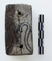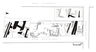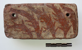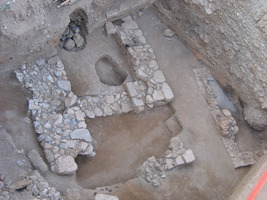 Earlier excavations in this sector had brought to light a large Myc building complex (Fig. 1) with floors of square bricks and fragments of wall-painting depicting a female procession. From July 2008 to January 2009, excavation at 3 Eurydike Street revealed a structure with a thick destruction layer of the M13th Ct, containing roof beams and cover tiles, many of which were found intact (and weighing between 8.5kg and 9.5kg each). This roof is estimated to have weighed at least 4 tons, and covered impressive, if poorly preserved, architectural remains, probably part of the Myc palatial complex (Fig. 2). Two especially large and well-built walls with door jambs, built in the Myc style of large roughly worked boulders with smaller stones wedged between them, form a central area, which contained fragments of frescoes. In the centre of the floor was a large bath tub with an impression on its base of a burnt basket which had been positioned next to it at the time of the destruction of the building. N of this central area was a rectangular open corridor, and a large covered area. From inside this room came much broken pottery, small glass beads with depictions in relief, burned fragments of painted wall-plaster, a steatite seal with a depiction of a horse and a gold attachment shaped like a flower petal. A spacious rectangular room excavated further N completes the plan of the building. Numerous drinking vessels (kylikes and cups) were found, along with a bronze dagger with gold rivet heads. However, the most important find was a 6-sided clay plaque (Fig. 3) with two holes for hanging, decorated with fish, possibly dolphin or tuna, on all 6 sides. A similar object (Fig. 4) was found in the previous excavation, along with an impressive dagger handle and a fragment of a bronze dagger with gold rivet heads on the clay floor of the neighbouring room. This also carried decoration on all four long sides, which are decorated alternately with a palm and chequered pattern. The building was destroyed by fire in the M13thCt BC. The data from both this and earlier excavations on the top of the citadel show that the region was at this time a fairly luxurious and densely populated neighbourhood of Myc Thebes.