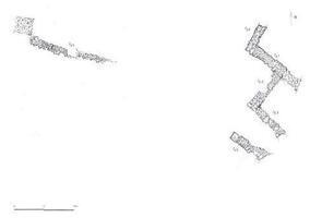 In the E of the site, another NS wall was found, whose width varied between 0.5 to 0.9m, and was 15.3m long. At its S, another wall (of width 0.5-0.65m and length 8.60m) intersected it in the orientation NE-SW, while at a further S point an EW wall also intersected. These walls were associated with Geometric period sherds, including also loomweights.