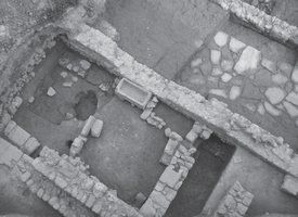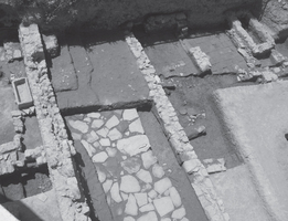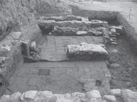 The paved street is built from large carved slabs with small stones placed in the intermediary gaps (Fig. 6,7). Its width is 3.50 m. wide and it is oriented from the W to the E, with an inclination towards the east. It is demarcated at the north and the east with two elongated walls, which have been consecutively repaired and altered. It is not impossible that at first the paved part of the street could have been used as an uncovered space at the interior of the Early Roman complex, which was later transformed into a road. In later building phases the paved street was covered by three successive layers of packed earth soil and shells, indicating the use of the road during the Byzantine period as well. North of the road and above the destroyed complex of the Early Roman times, isolated walls of a Late Roman building were also discovered.