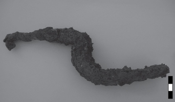 An Early Christian workshop area was uncovered in relatively good condition on the eastern part of the road (Fig. 7,8), which was constructed above the destruction layer of the Early Roman complex of the 1st c. AD. Two more building phases were identified; the older dates to the 4th-5th c. BC. The workshop area is divided in two uneven parts. The floor is consisted from packed earth with traces of burning above the agglomerated building material of the destruction layer. In contact with the north wall, a stone basin in secondary use was located. An iron trowel (Fig. 9), metal slags and an obsidian fragment from Nisyros were found in association with the basin. Eastern of the basin, a perfunctory rectangular structure was unearthed, while lengthwise of the east wall of the room, rectangular parts of gray clay were detected. Moreover, two uneven cavities were identified on the earthen floor of the west part of the room, coated with small stones which were purposed for supporting vessels or workshop use.