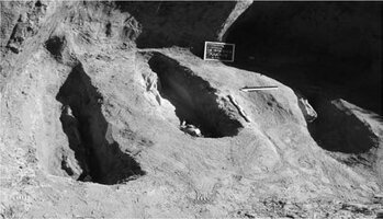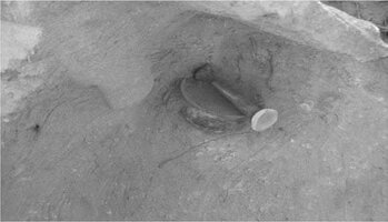Further investigation led to the discovery of a further four pit burials (Fig. 2). All four pits were divided into two halves by a rubble wall and in all half was left empty (Fig. 3). The first pit contained skeletal remains, possibly female, along with a three-handled amphora, a three-handled straight-sided alabastron, a bronze ring and a total of 200 beads of steatite and carnelian. The second pit contained male skeletal remains, along with a three-handled alabastron, a razor and a whetstone. Above this interment was a Mycenaean figurine of type Φ found within a dipper and below a large slab which was probably the headstone. The third pit contained rare skeletal remains belonging to a child, along with a rounded alabastron. The fourth pit contained skeletal remains and was richly furnished with three metal objects, a kylix, a small three-handled amphora and three sealstones of steatite. According to the excavator, this final grave probably belonged to a person of status.