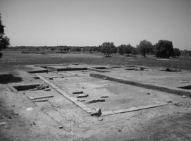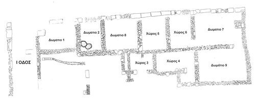 The western part of building ΣΤ/Α was located in the northern and western parts of the area defined by the three major roads of the town. It was defined to the north by building ΣΤ, to the west by the road-side colonnade of street II and to the south by the western part of street I. Its excavated dimensions were 28.5 m. by 10.0 m. and it was crossed by wall 2, on either side of which were nine interior rooms (Figs. 5, 6). In two of these (2 and 6) were found storage pithoi. All of the rooms were covered by a destruction layer, while additional finds included Roman and Late Roman/Early Christian pottery, bronze coins and a few other bronze objects including two fish hooks and part of a scale. In addition, parts of a mosaic were found on the eastern wall of room 3. The excavator has suggested commercial and industrial activities were carried out in the building.