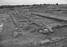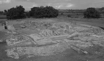 In Building Rho (south-eastern part of sector H), excavations located a further five rooms, along with the four discovered in previous years. These were of different sizes while in room 2 was part of a floor paved with marble slabs resting on white mortar. In room 1 were hypocausts and a cistern (2.30×1.90 m.) lined with plaster. Based on these structures, the excavator identified the building as a bath. Additional finds included a clay stamp, pottery, architectural remains, glass vases, figurines, bronze objects, coins and bone artefacts including a fragment of an abraded bone medallion (depicting a gorgoneion?).