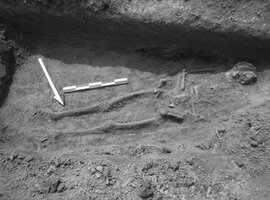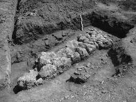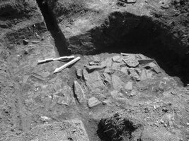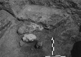 Staphidokambos. Christos Matzanas (Z’ ΕΠΚΑ) reports on the excavation of a deposit containing pottery, stones, bricks, metal and stone objects dated to the 3-4th centuries AD (Figs. 1, 2). Also excavated was a Christian burial with the body of a male in extended position, arms folded across the chest and head facing east (Fig. 3). There were no grave goods. Bones from another burial, possibly secondary were also found. In addition, there was a wall which formed part of a Late Roman building made of rubble. Aligned on an E-W axis, it was preserved to a height of one course of stones (Fig. 4). The excavation produced a few pottery sherds, tiles, charcoal and animal bones.