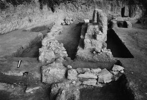 Vrachnaiika, Monodendri (property of K. Diamandopoulou). Vasiliki Tsaknaki (ΣΤ’ ΕΠΚΑ) reports on the discovery of two rectangular sandstone blocks (0.90×0.60×0.50 m. and 1.25×0.60×0.40 m.), placed vertically as door pillars, creating an opening of 0.55 m. in width. They formed part of a 5.60 m. long wall aligned on a N-S axis, made of stones and reused spolia. Another wall of 5 m. in length was located about 1.40 m. to the south. The two walls enclosed an area, the southern edge of which was defined by a third wall made of spolia. According to the excavator, the walls formed part of a large building which was probably in decline, as indicated by the reuse of architectural materials. About one meter to the east of the sandstone pillars was an inurned cremation, a female figurine and a complete pot dated to the Hellenistic period.