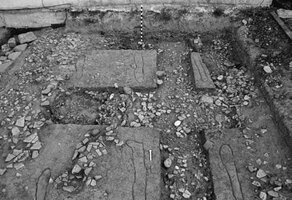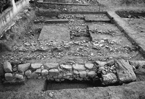 Kato Achaia, 25th of March Street (property of N. Lekka). Georgia Alexopoulou (ΣΤ’ ΕΠΚΑ) reports on the discovery of two intersecting walls belonging to a building of the Early Hellenistic period (Fig. 1). They were made of large sandstone blocks and smaller stones, bound with clay. To the east of the building was a pebble road of 11.40 m. long by 5.50 m. wide, aligned on a N-S axis. The road was made of beaten earth and pottery sherds and its surface was covered by a thick destruction layer (Fig. 2). It was used during the Hellenistic and Roman periods. A small number of burials and gullies associated with vine cultivation were excavated along the side of the road (Fig. 3).