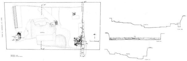 Kato Achaia, Palaion Patron Germanou Street, Ο.Τ. 73 (property of Th. Siaka). Vasiliki Tsaknaki (ΣΤ’ ΕΠΚΑ) reports on the discovery of a wall (1) aligned on a N-S axis and 12 m in length, which continued into the adjacent property (Fig. 1). It consisted of rows of carefully made limestone, sandstone and amygdalopetra limestone blocks, probably reused from a public building in ancient Dyme. Another two walls were investigated together with a domestic pit (10.70×6.20 m.). In the south-western corner of the property was a well (0.90 m. internal diameter) dated to the Early Hellenistic period and constructed of sandstone blocks. In the northern part of the property was excavated part of an unfluted column.