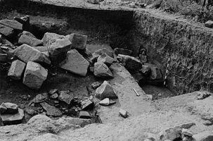 Kato Achaia, Mitropolitou Derkon Street (property of I. Konstantinopoulou). Adamantia Vasilogamvrou and Vasiliki Tsaknaki (ΣΤ’ ΕΠΚΑ) report on the discovery of fallen sandstone blocks from the western section of the fortification walls of ancient Dyme (Fig. 1). The blocks covered the surface of a pebble road which led to one of the gates in the wall. Excavations in the eastern part of the area located the foundations of a building, made of conglomerate and limestone, along with a series of destruction layers. Three pits attributed to the Late Classical to Hellenistic periods were also found, along with two Roman inurned cremations.