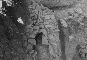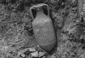 Vrachnaiika, property of Α. Roumelioti. Georgia Alexopoulou (ΣΤ’ ΕΠΚΑ) reports on the discovery of a tile covered grave of 1.40 m. in length, covered by a number of small slabs and aligned on an E-W axis (Fig. 1). The body of the adult male had been placed in an extended position with arms folded over the abdomen. A Late Roman pointed amphoriskos (LRI type) had been placed next to the cranium (Fig. 2).
