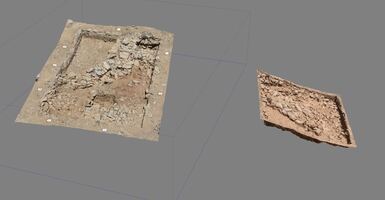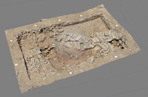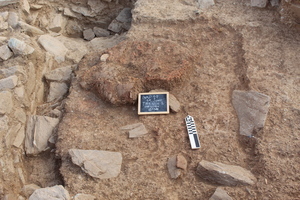 Les travaux se sont concentrés sur le plateau supérieur de la colline et dans la partie Sud : ils ont livré des vestiges de constructions ainsi que de nombreux objets. On note ainsi la mise au jour de murs courbes et droits, construits en pierre, qui d’après leur stratigraphie, témoignent de plusieurs états de construction (fig. 2-3). En plus des murs, on a découvert deux banquettes construites en pierre, ainsi que des fosses dépotoirs, une couche étendue d’argile de construction brûlée et une structure thermique (four? ; fig. 4).