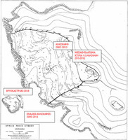 Sur l’îlot en face de Vryokastro, les prospections des années 1990 avaient mis en évidence les phases les plus anciennes et les phases les plus récentes de la ville antique. Les fouilles en 2018 ont porté sur trois secteurs : la basilique protobyzantine (Édifice 1), l’édifice allongé (2), le « Complexe Sud » (fig. 6-7).