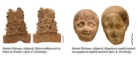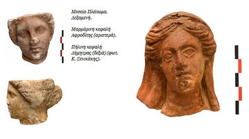 Le fond de la citerne était recouvert d’une couche argileuse qui a révélé un seau en bronze avec des poignées en argent. La couche suivante était sableuse et contenait de nombreux tessons de céramique (de la céramique commune, surtout de petites cruches) et représente la dernière période d’utilisation de la citerne à l’époque romaine. Le remplissage de la citerne comportait de nombreux blocs provenant de l’élévation de l’édifice adjacent, comme des antéfixes à fleurons (fig. 3), des fragments de chapiteaux et de tambours de colonnes doriques. On a recueilli de nombreux fragments de sculpture en marbre, notamment deux têtes d’enfant (un garçon et une fille, de l’époque classique ; fig. 3), une petite tête d’Aphrodite de l’époque hellénistique et une petite tête de Déméter provenant d’une grande figurine de la fin de l’époque classique (fig. 4). L’identification du sanctuaire au culte d’Asclépios et à celui d’Aphrodite est confirmée. Le culte des dieux de Samothrace est également attesté par l’épigraphie.