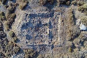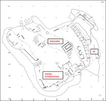 À l’Est de la basilique, se trouve un édifice allongé (Édifice 2), d’une longueur de 80 m, constitué de 15 pièces orthogonales alignées. Les murs extérieurs du complexe sont épais (1 m) : la hauteur du mur oriental, environ 10 m par rapport à la surface de la mer, indique le caractère défensif de la construction. Deux constructions en avant du mur peuvent être interprétées comme des tours ou des bastions.