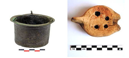 La fouille s’est concentrée sur une pièce du complexe, la pièce IB (dim. 5 x 6 m ; fig. 9). Son entrée se trouve à l’extrémité Nord du mur Ouest. À première vue les autres pièces avaient des entrées à l’Ouest également : elles étaient indépendantes et ne communiquaient pas entre elles. Dans la pièce IB, une série de creusements correspondent à un escalier qui menait de la porte à un niveau inférieur. Deux cavités dans le mur orientale (T1) indiquent qu’un plancher était installé à environ 1 m de hauteur par rapport au sol de la pièce. Dans les niveaux stratigraphiques inférieurs de la pièce, on a recueilli de la céramique de l’époque romaine tardive-protobyzantine. Dans l’élévation des murs on note la présence de remplois en marbre et un mode de construction peu soigné. Le niveau d’abandon comprenait du mobilier de l’époque romaine tardive/protobyzantine : un encensoir en bronze et une lampe en terre cuite du Ve s. apr. J.-C. (fig. 10). Il existe néanmoins des indices d’un état beaucoup plus ancien : sous la pièce IB, on reconnait un espace aménagé dans le rocher, d’une orientation légèrement différente, ainsi que la présence de céramique qui remonte au Protocycladique, au début de l’époque géométrique et après, qui ne permettent néanmoins pas de dater précisément les états de construction de l’édifice. Parmi le mobilier recueilli dans les niveaux de remplissage, on note un couvercle en marbre provenant d’une urne cinéraire.
