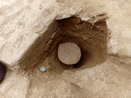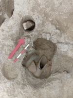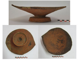 La fosse de réduction no 10 s’est révélée particulièrement importante (fig. 6). Elle conservait peu de traces de feu et aucune scorie, contrairement à toutes les autres. Elle est profonde et de forme conique. Un peu plus bas que son embouchure, elle avait un petit creusement latéral, à l’intérieur duquel se trouvait un grand galet marin. Plus bas, vers le fond de la fosse, était placé une base en forme de pi, constituée de trois fragments courbes d’argile crue (fig. 7). Sur cette base était placée une grande coupe dont les parois supérieures avec les anses avaient été coupés intentionnellement de sorte que le vase puisse entrer exactement (fig. 8). La coupe ne comporte pas de décor, elle est faite en argile local, mais a une forme qui ressemble aux vases attiques. Il s’agit d’une coupe de type C, avec un tore sur une base de faible hauteur, un type qui est fabriqué dans les ateliers d’Athènes à la fin du VIe s. av. J.-C. et au début du Ve s. av. J.-C. et qui disparait petit à petit d’ici 480 av. J.-C. La forme de Tinos date au plus tard du début du Ve s. av. J.-C. Il est difficile de définir le caractère fonctionnel de réduction de minerai pour cette fosse qui comportait la coupe. Le remaniement de la coupe afin qu’elle rentre exactement sur la base en pi dans la fosse suggère un placement intentionnel et rituel avec une importance particulière. Des traces de feu à l’intérieur de la coupe semblent indiquer sa fonction rituelle, de même que le galet. Il est très probable que cette « mise en scène » signifie la fin rituelle de l’utilisation de l’atelier à la fin du VIe s. ou au début du Ve s. av. J.-C.