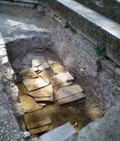 A cist grave was excavated a few cm S of a marble sarcophagus excavated in 2000, a short distance from the N wall. The grave is 2.25 x 0.67m, with a preserved height between 0.75-1.04m. The base of the tomb was lined with tiles, some of which were bound with a light-coloured mortar. Two burials were located inside the grave, but it is thought that the total material found could belong to four people. There was one adult skeleton of an individual 1.70m in height, with its head placed to the W. A second individual was located S of this, but the bones were badly preserved. A few other scattered bones were found, and four more skulls to the W of the grave. Ceramics from the grave are dated to the thirteenth and fourteenth century AD.