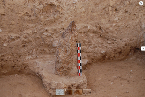 In the last season of fieldwork, parts of the tiling of the Archaic temple came to light, as well as part of the hair (curls) in clay, probably part of the pedimental decoration of the Archaic temple. At a lower level, a wall orientated N-S was excavated, probably part of a building of the 8th century BC (Fig. 2) and, to its east, a layer with consumption vessels (kantharoi, skyphoi, oinochoai, and an amphoriskos) together with animal bones and remains of burning (Figs 3-4). According to the excavators, these are probably remains of ritual meals and offer particularly important information for the study of the ritual and social characteristics of the community. Also discovered were bronze objects and iron spear points (Fig. 5), as well as parts of unfired mudbrick with plaster preserving red colour.