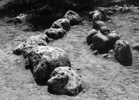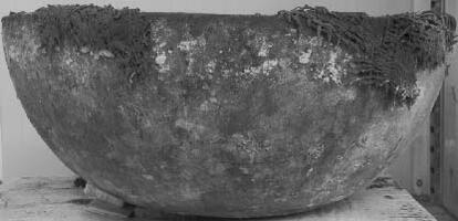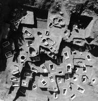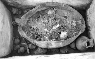 - T588: 2m SE of Tomb 587 and measuring 1 x 0.92m, the grave was oriented E-W and was overlaid by successive burnt layers within which sherds of handmade ceramics and an impressive head of a bovine figure were recovered. The limestone cover-slab (1.35 x 0.95m) had a smaller slab placed about it (0.65 x 0.52). A bronze bowl contained the burnt bones of the deceased in a small wooden box that was covered with a variety of woven textiles. Tomb also contained two PG kantharoi and a trefoil oinochoe.