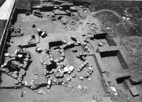 The upper layers of the tumulus had been badly damaged already in the 1880s by the construction of the Kaphalovrso railway station, and almost all the stone peribolos had been removed. Rescue excavations in 1998 revealed only small semi-circular section 5m long of the peribolos, inside of which was another ring of smaller stones. Terracotta figurines, one zoomorphic and two anthropomorphic, were found between the two circles. Graves were found at various levels comprising cist graves, pyres, pithos burials, as well as sandstone foundations of structures, and stone piles. A stone construction of square or irregular areas was discovered at the SE of the site built of rectangular grey-green sandstone quarried from the nearby Psili Panagia hill and transported along a special track. These areas did not contain graves, but some clay anthro- or zoo-morphic figurines were recovered.