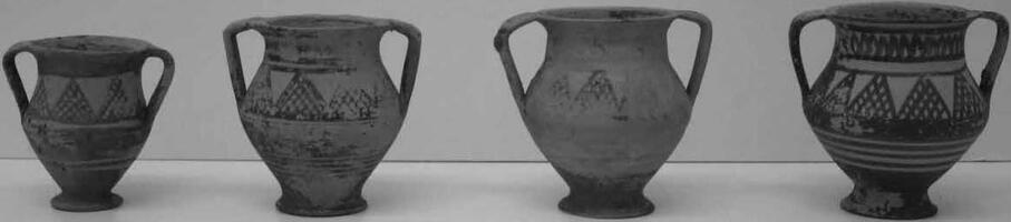 T590: cist grave: 2 kanthariskoi, 14 amphoriskoi, a krateriskos, 2 trefoil oinochoes, a lekythos-shaped amphoriskos.